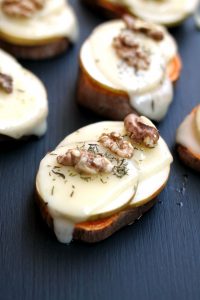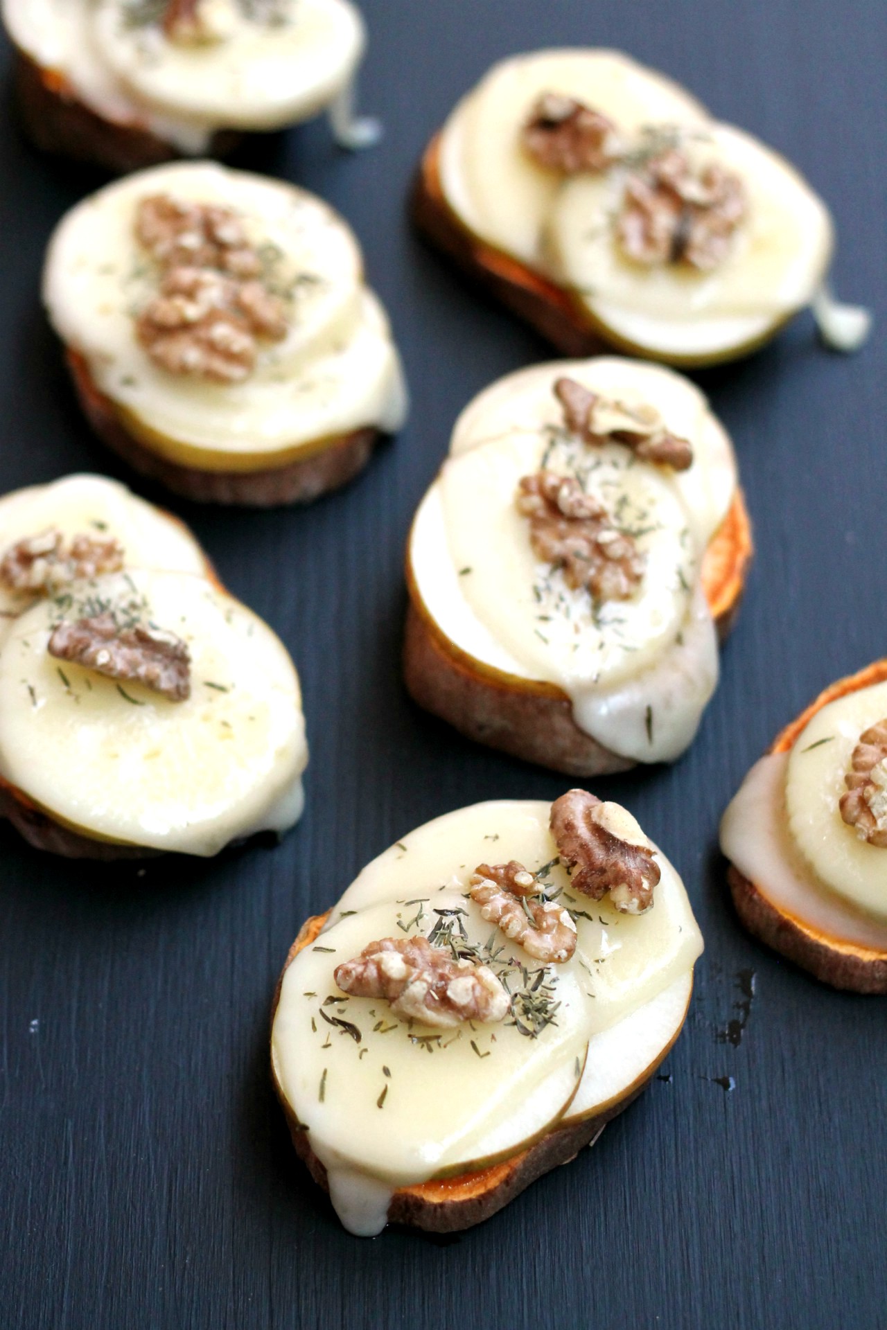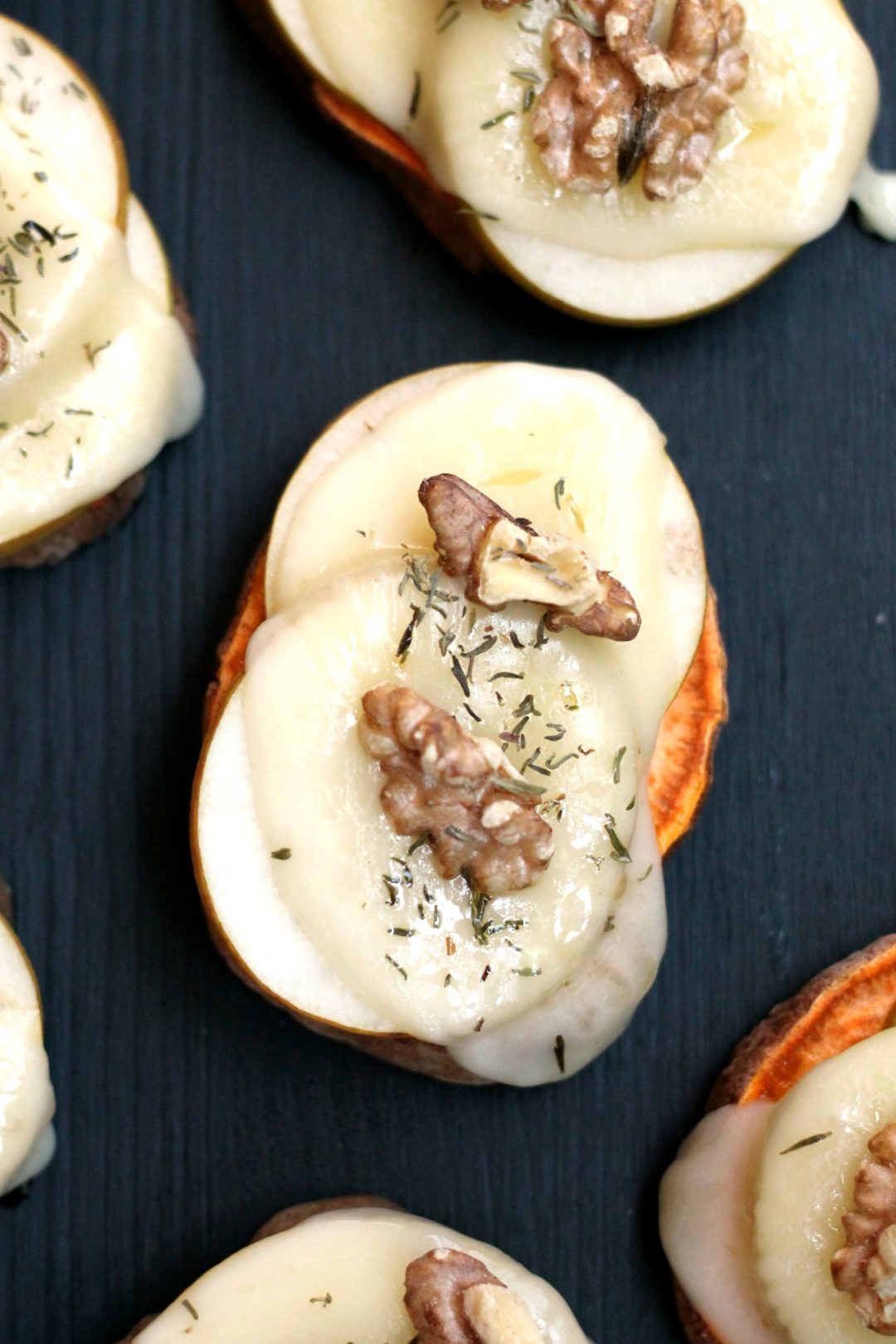 Ricoprire le fette di patata americana con le fette di pera, distribuire sopra la provola piccante e completare con le noci e il timo.