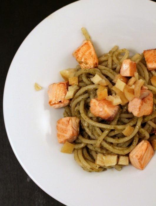 primi piatti Spaghettoni al pesto di finocchietto selvatico con salmone e limoni confit 21 Giugno 2018